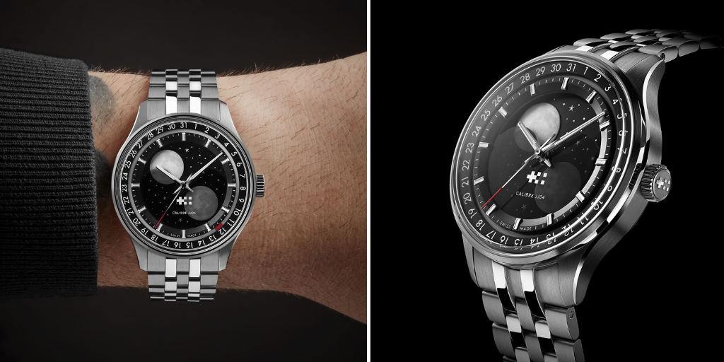 This watch features a 30-minute counter, day and month display at 12 o’clock, a central 60-second hand, and a moon phase with a 12-hour counter at 6 o’clock.”